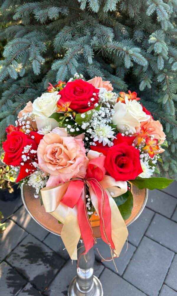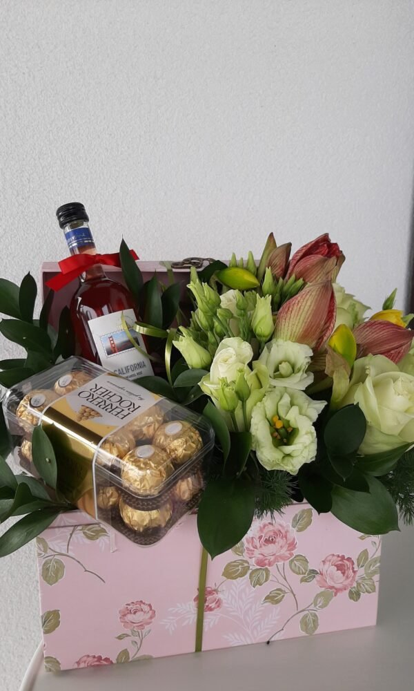 cufar cu flori naturale, sampanie si cutie bomboane