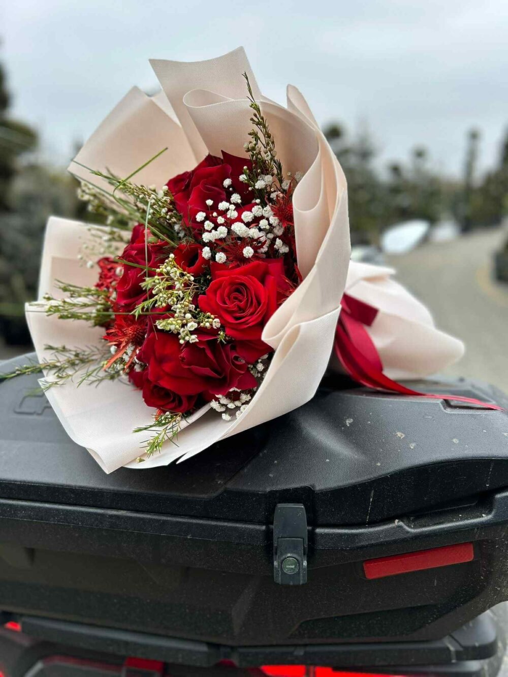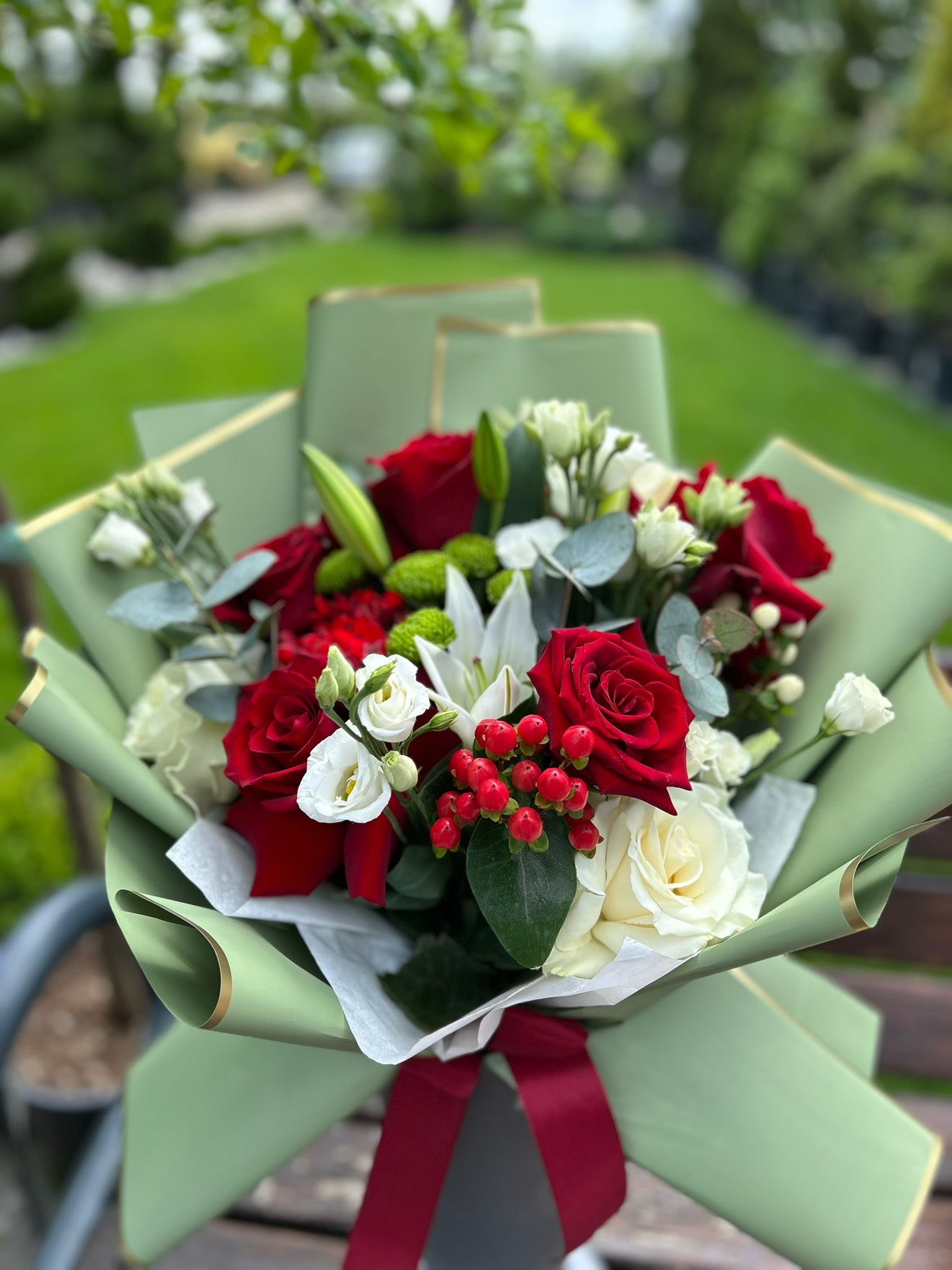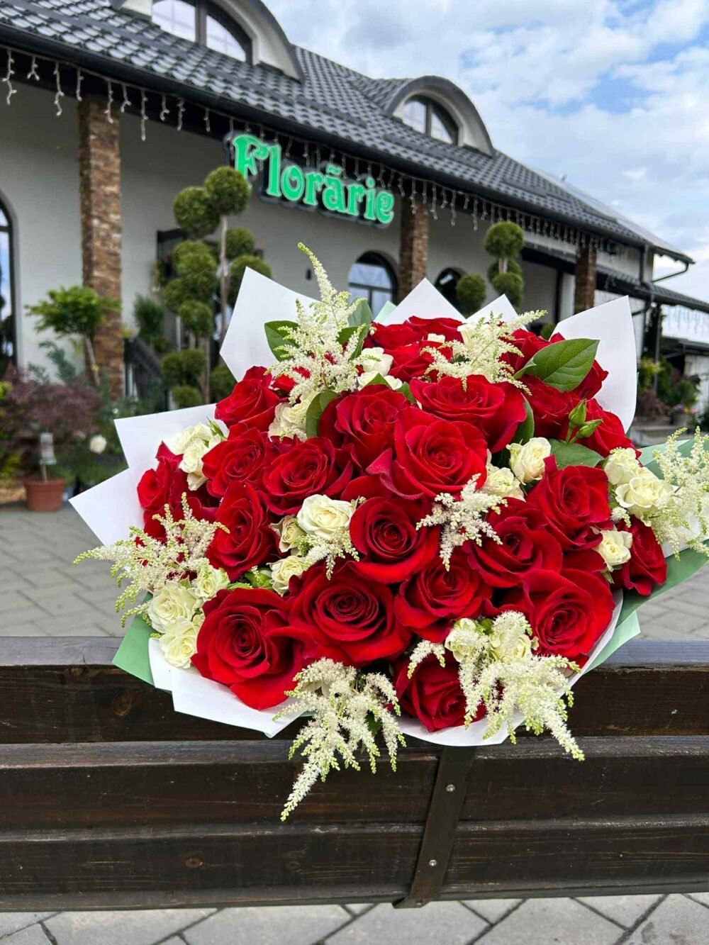 BUCHET TRANDAFIRI ROSII ASTILBE ALBE