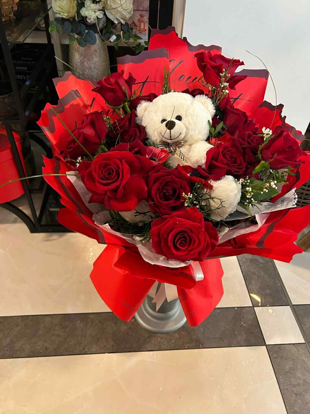 BUCHET TRANDAFIRI ROSII SI URSULET