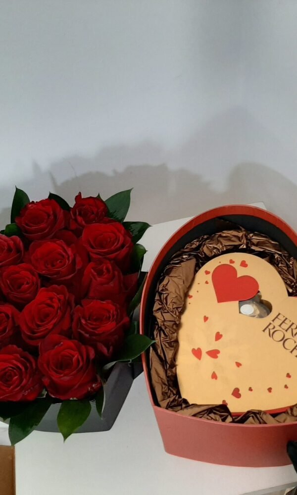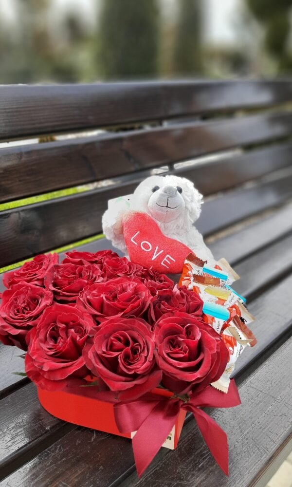 Cutie inima cu trandafiri, ursulet si ciocolata